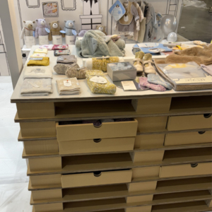 展示会什器のパレットです。ダンボールパレットは輸出入の際に木材の代わりに強くて廃棄も資源ごみとなるため人気がありますが、こんな感じにディスプレイとして活用するとオシャレですよね。